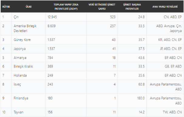 Not: 2024 yılının ilk 10 ayını kapsamakla birlikte 930’dan fazla bağımsız kuruluştan veri alınarak hesaplanmıştır. Tabloda yapay zekâ patentlerinin ait olduğu ülkeler Yapay Zekâ Endeks kodları kullanılarak listelenmiştir.