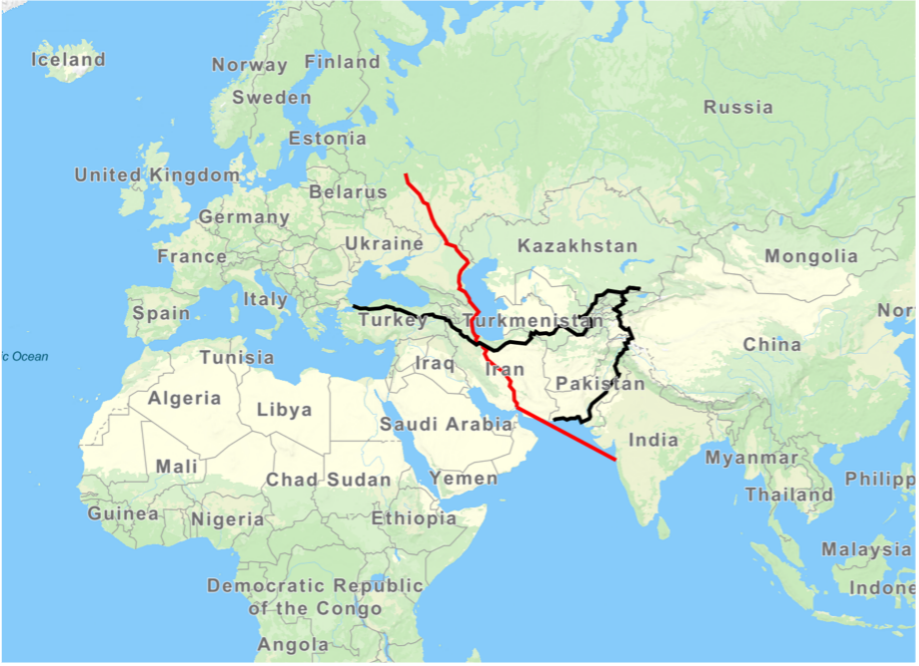 Yandaki harita kırmızı ile gösterilen Rusya’nın başını çektiği Kuzey-Güney Taşımacılık Koridoru projesi iken siyah ile gösterilen ise Çin’in 2013’ten itibaren yürüttüğü Kuşak ve Yol projesinin güncellenmiş İpek Yolu haritasını göstermektedir.