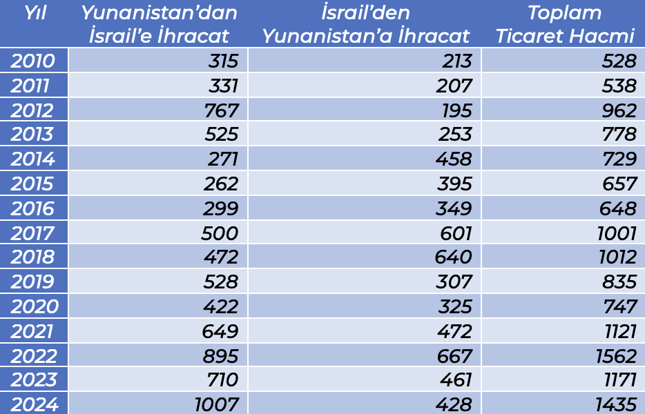 Tablo 1: İsrail-Yunanistan İkili Ticaret Dengesi (2010-2024) (Milyon Dolar)