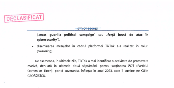 Auszug aus dem vom rumänischen Geheimdienst veröffentlichten Bericht: „Es wurde zudem festgestellt, dass in den letzten zwei Wochen auf TikTok eine intensive Werbekampagne durchgeführt wurde, um die souveränistische Partei POT (Jugendpartei) zu unterstützen, die wiederum Călin GEORGESCU unterstützt.“